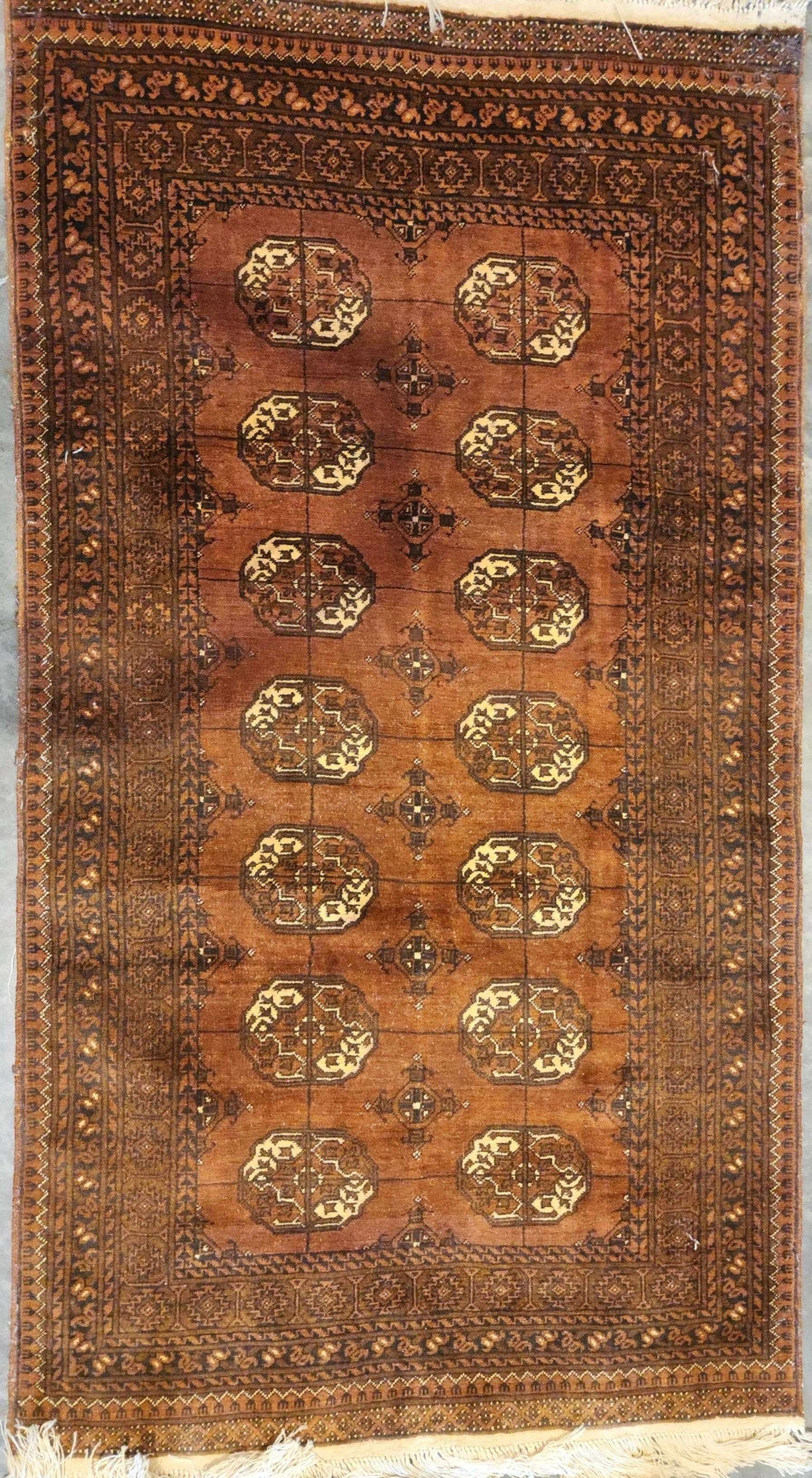 This Brown Bukhara Handmade Vintage Carpet, measuring 4 feet by 6 feet, is a striking example of the timeless beauty and craftsmanship of traditional Turkoman weaving. The rich brown background is complemented by a series of repeating "gul" motifs, a signature design of Bokhara carpets, which are intricately woven in deep reds, blacks, and ivory. The symmetrical patterns create a sense of order and balance, showcasing the meticulous attention to detail that went into its creation.