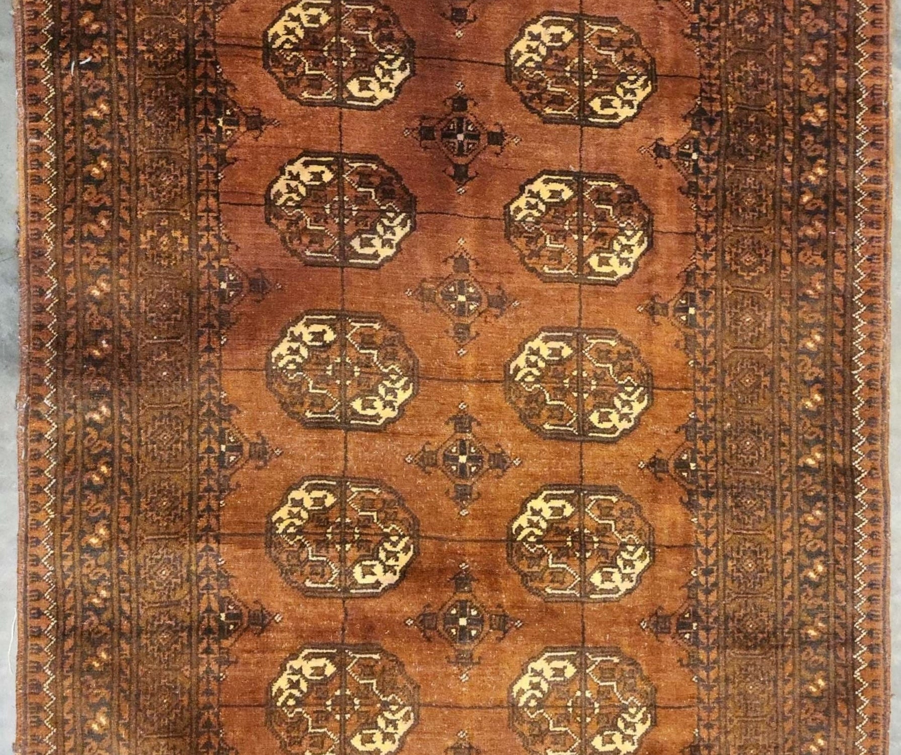 Handwoven from high-quality wool, this vintage carpet offers both durability and softness underfoot, with a smooth texture that enhances its luxurious feel. The fine knotting and craftsmanship are evident in every inch of the rug, reflecting the skill and expertise of the weaver. The earthy tones of the brown field, combined with the bold geometric motifs, make this piece versatile enough to complement both contemporary and traditional interiors.