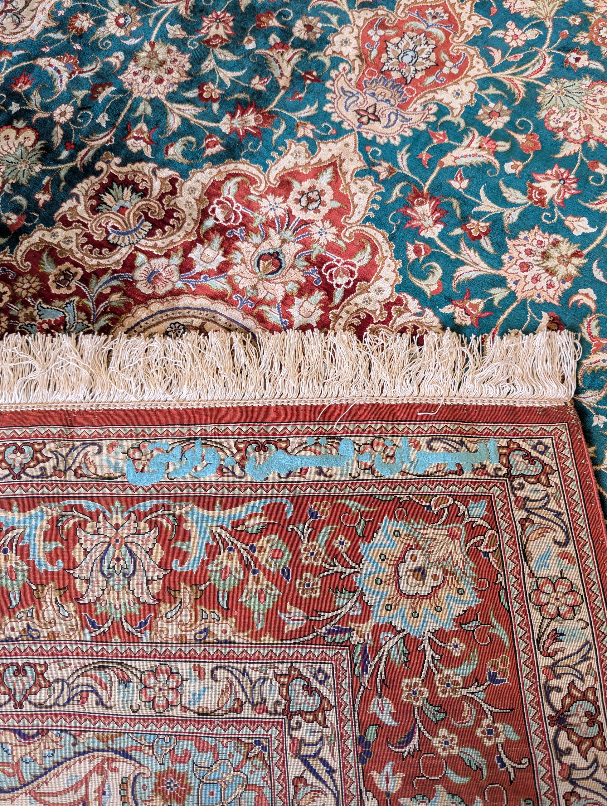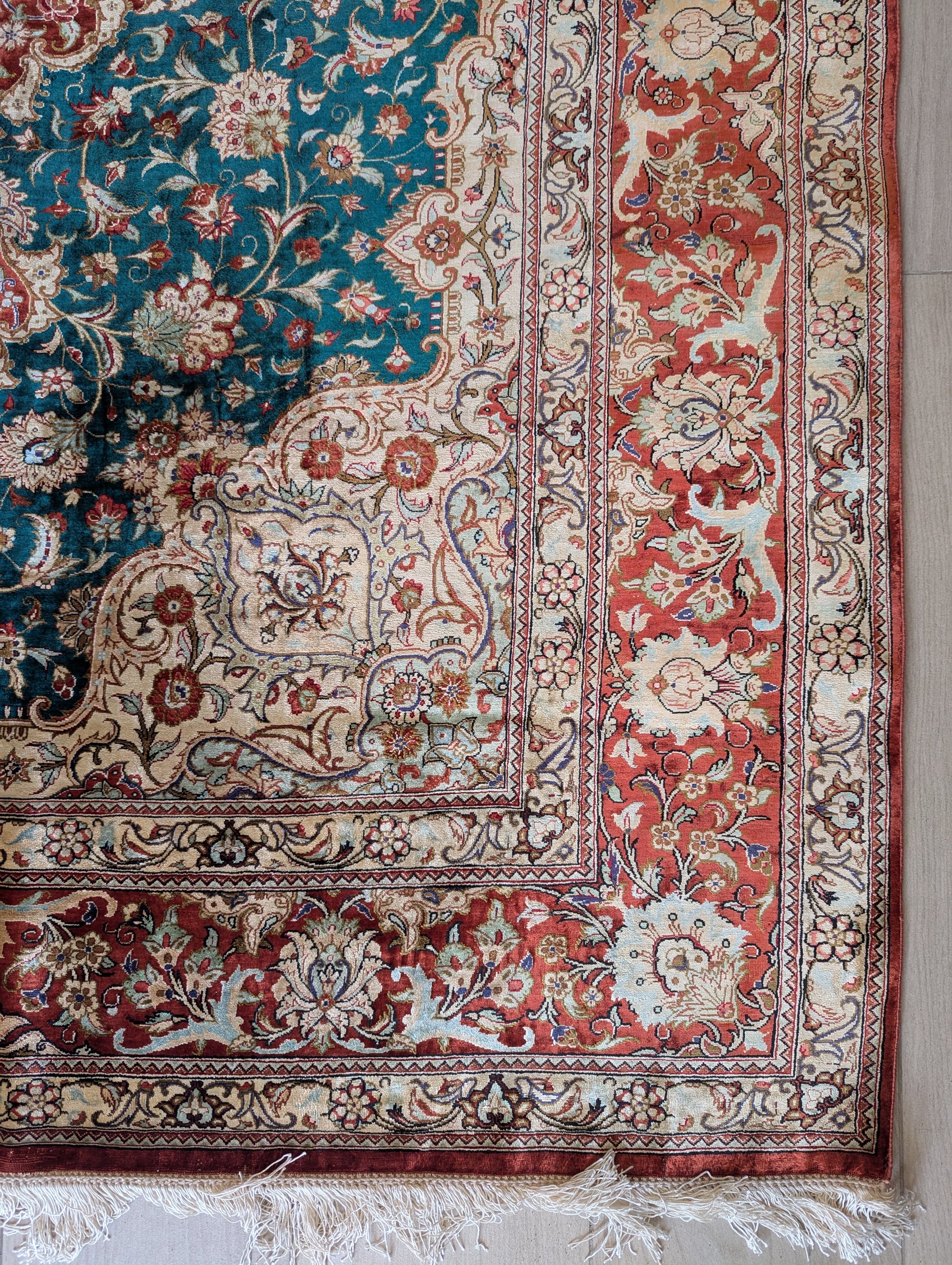 Elevate your space with this exquisite handmade Green Qom rug, woven in the heart of Iran’s Qom region. Crafted from a luxurious silk-wool blend, this 4.5 x 7 ft rug features intricate floral medallion motifs on a rich emerald green field, framed by a beautifully detailed red and ivory border. Known for their exceptional craftsmanship and high knot density, Qom rugs bring timeless elegance and cultural heritage into your home.