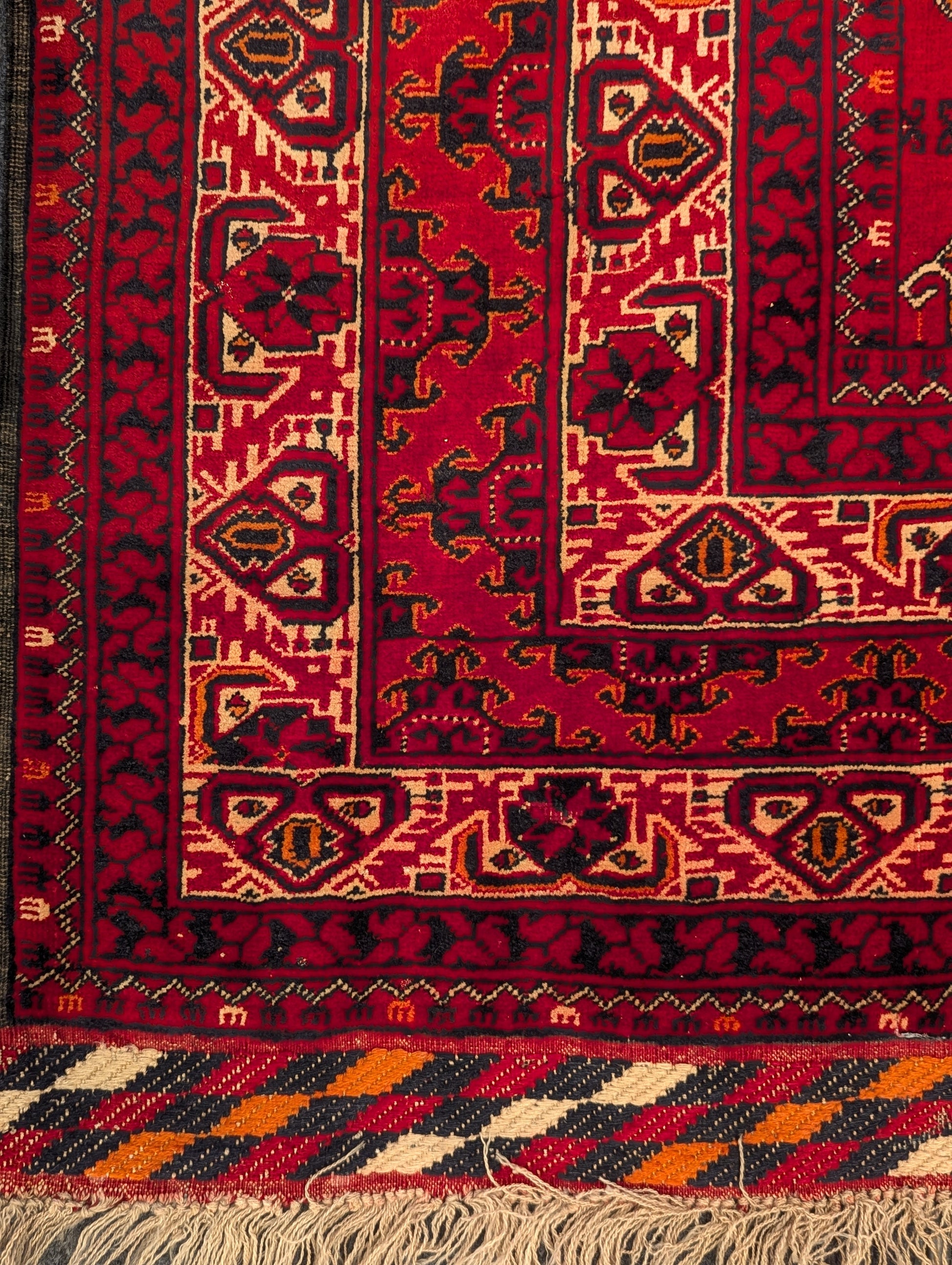 The rug’s deep red field is complemented by detailed black, ivory, and navy blue motifs, while the striped kilim ends add a touch of tribal authenticity. Made from 100% hand-spun wool, this rug is not only soft underfoot but also highly durable—perfect for high-traffic areas like living rooms, offices, or formal spaces.