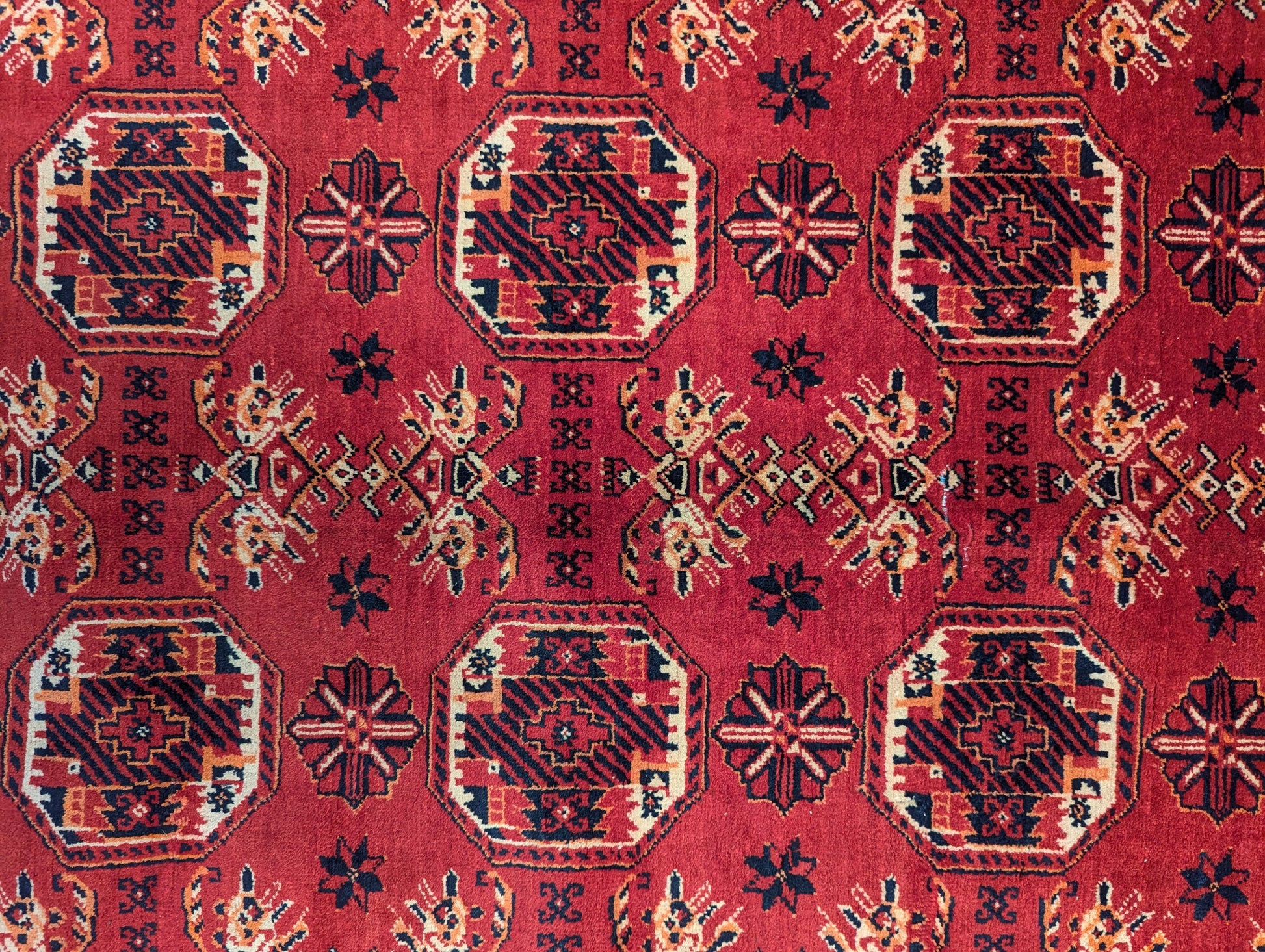 Add timeless character to your space with this hand-knotted Bokhara rug, showcasing a classic Tekke gul pattern arranged in neat, repeating rows. Featuring a rich red base, this 7x10-foot rug is a stunning representation of traditional Pakistani craftsmanship, woven with precision and care.