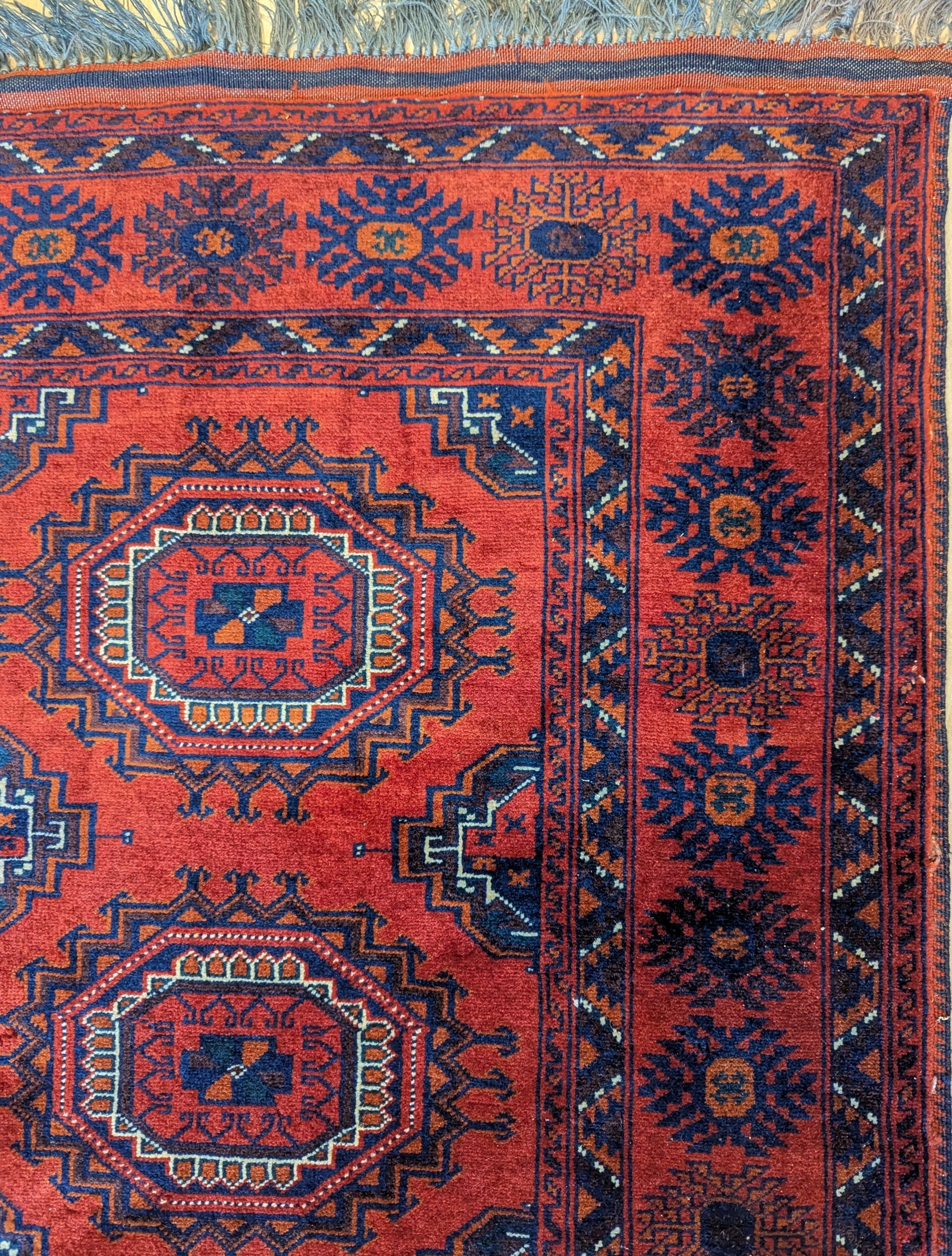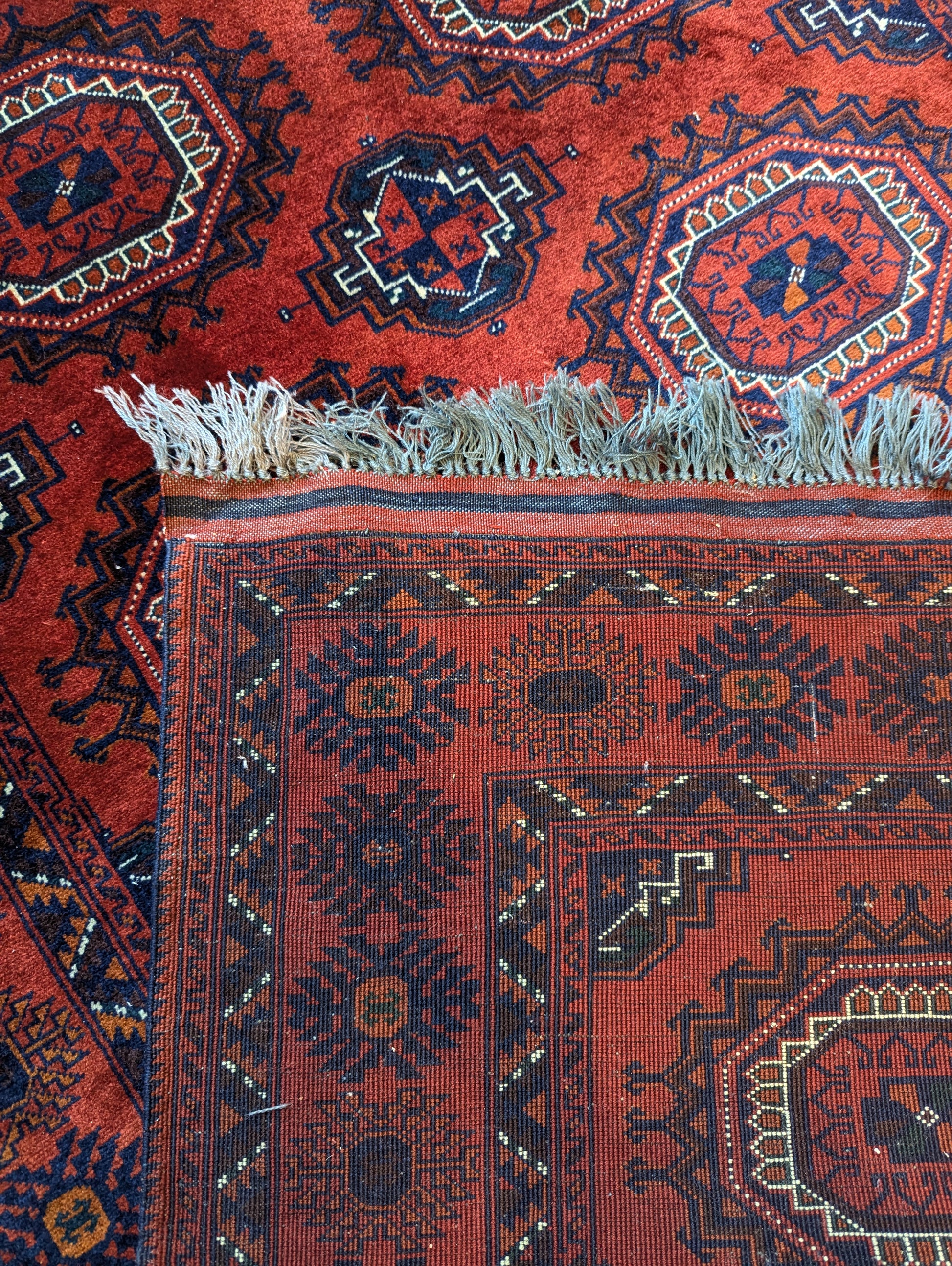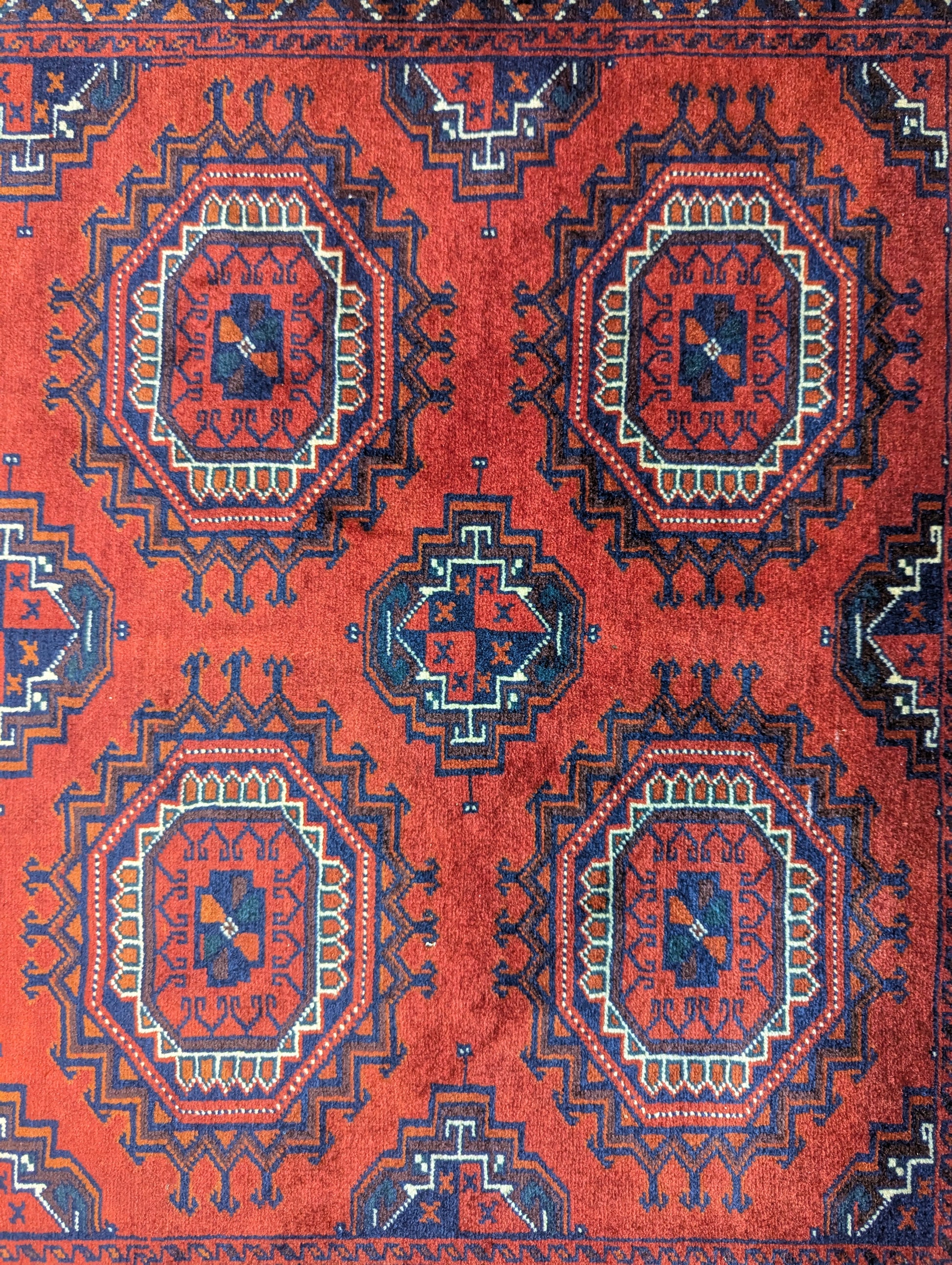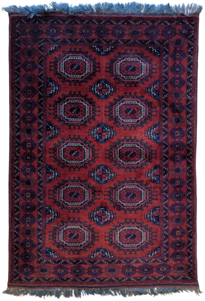 Add timeless elegance to your home with this handwoven 3x5 ft Khal Mohammadi rug, crafted by Afghan Turkmen artisans using traditional techniques. Known for its rich burgundy-red tones and symmetrical gul motifs, this piece reflects the heritage and precision of Northern Afghan weaving.