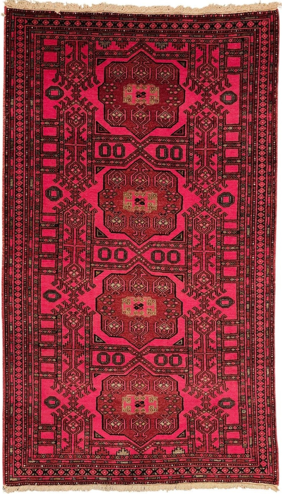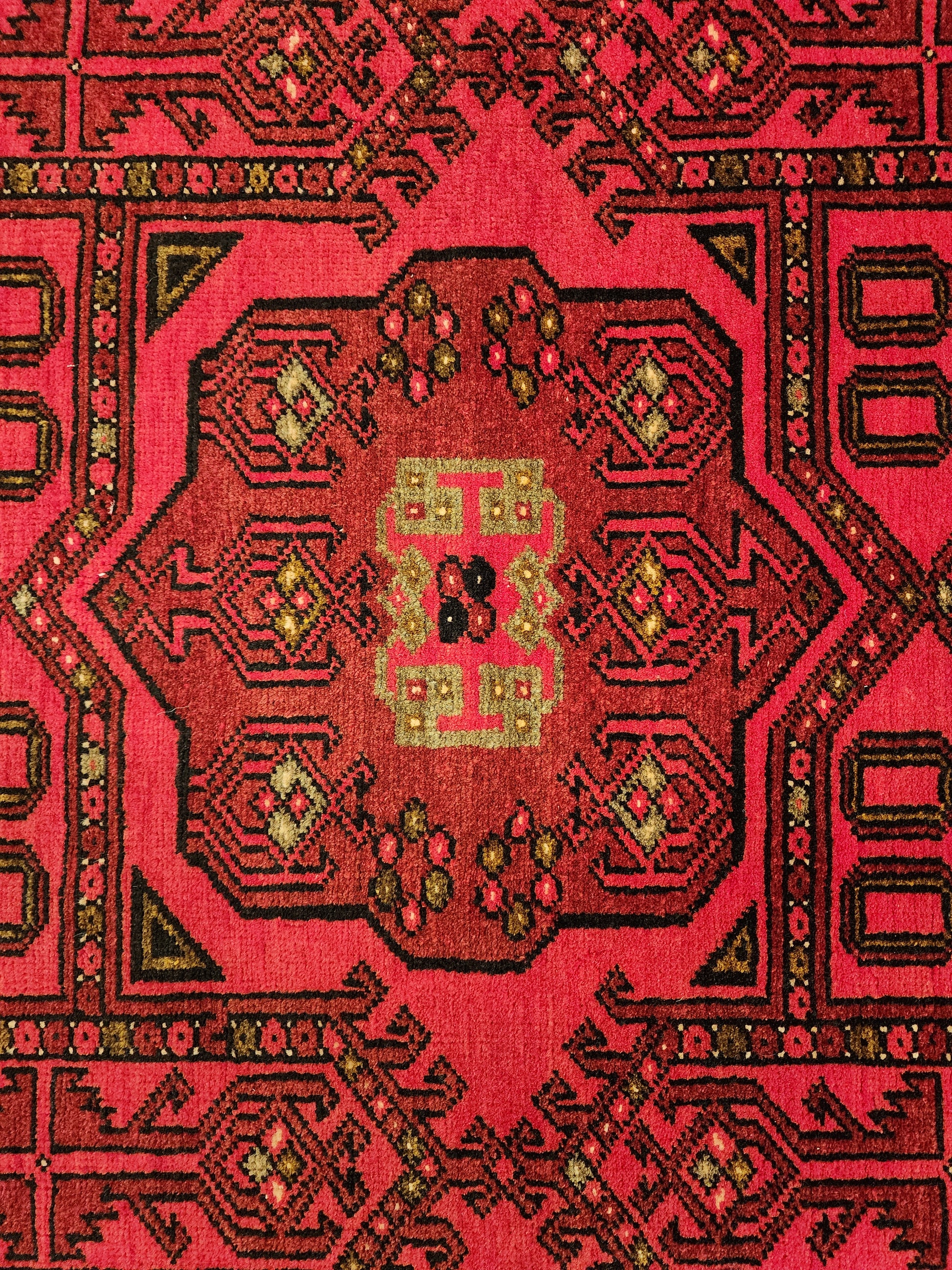 This elegant pre 1980 Khal Mohammadi rug, measuring 3 x 6 feet, is a fine example of traditional Afghan tribal weaving. Hand-knotted in northern Afghanistan, the rug features bold octagonal gul medallions arranged on a deep red and burgundy field, framed by intricate geometric borders.