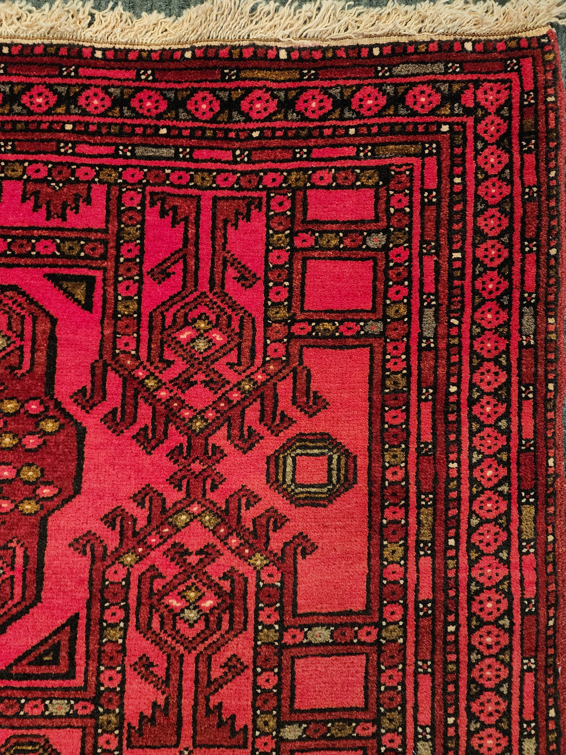 Crafted from hand-spun wool and naturally dyed using vegetable roots, Khal Mohammadi rugs are known for their durability, vibrant color depth, and timeless appeal. The balanced tribal layout and rich tones make this piece ideal for entryways, corridors, offices, or statement nooks.