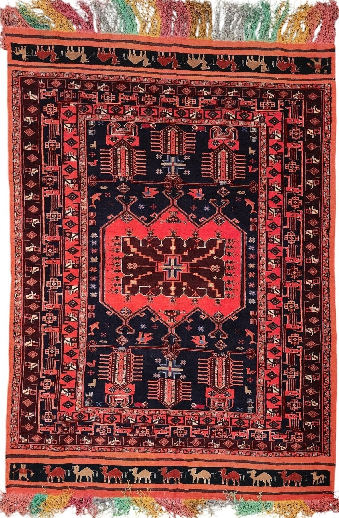 The rug features a commanding central medallion flanked by stylized tribal totems, symbolic birds, and animal motifs. A captivating camel caravan borders the top and bottom edges — a classic hallmark of Qashqai design. Rich tones of deep navy, terracotta red, ivory, and soft accents of ochre and green bring warmth and soul to any space.