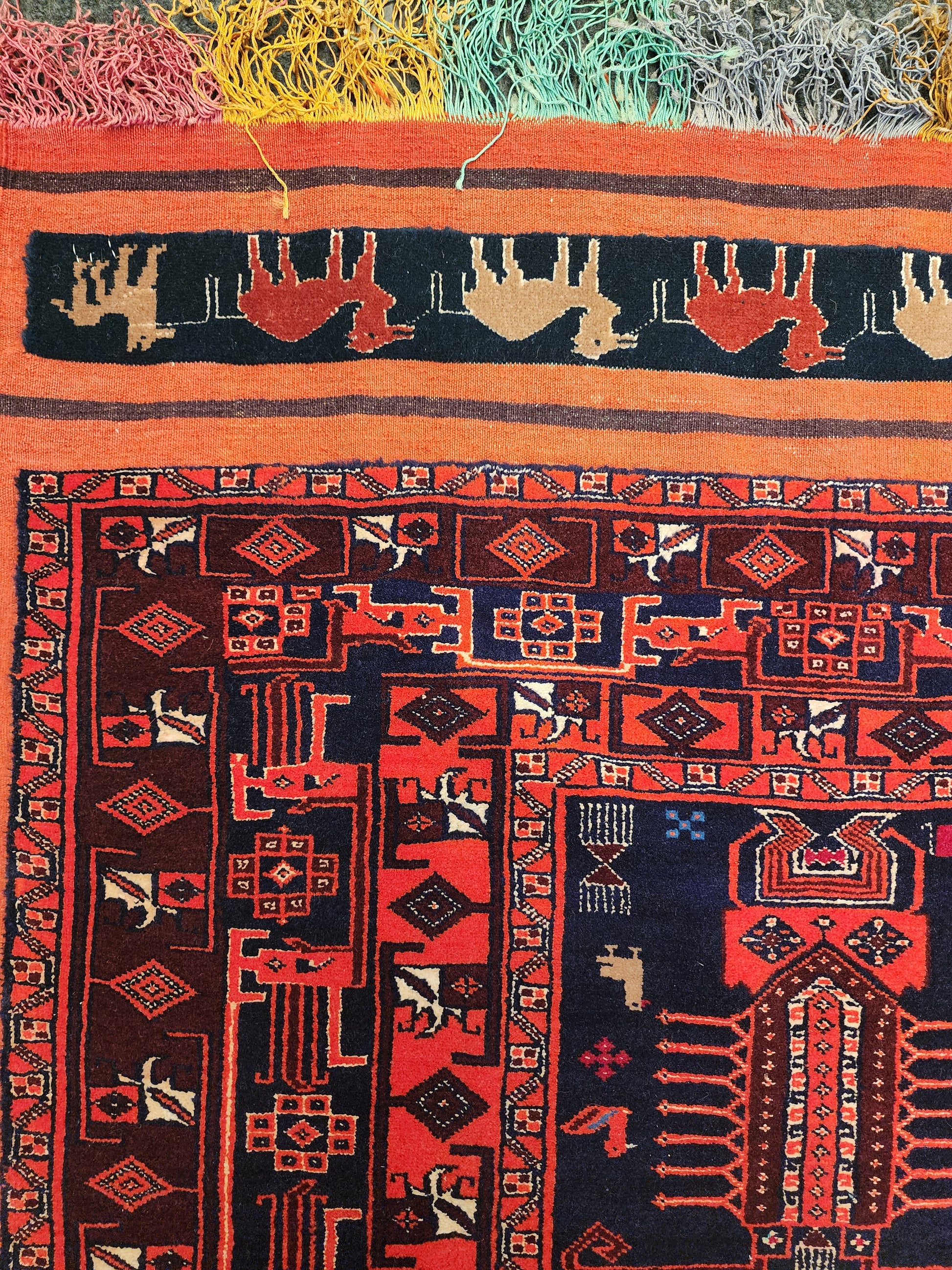 Colors: Orange, navy blue, red, ivory, multi-colored fringe