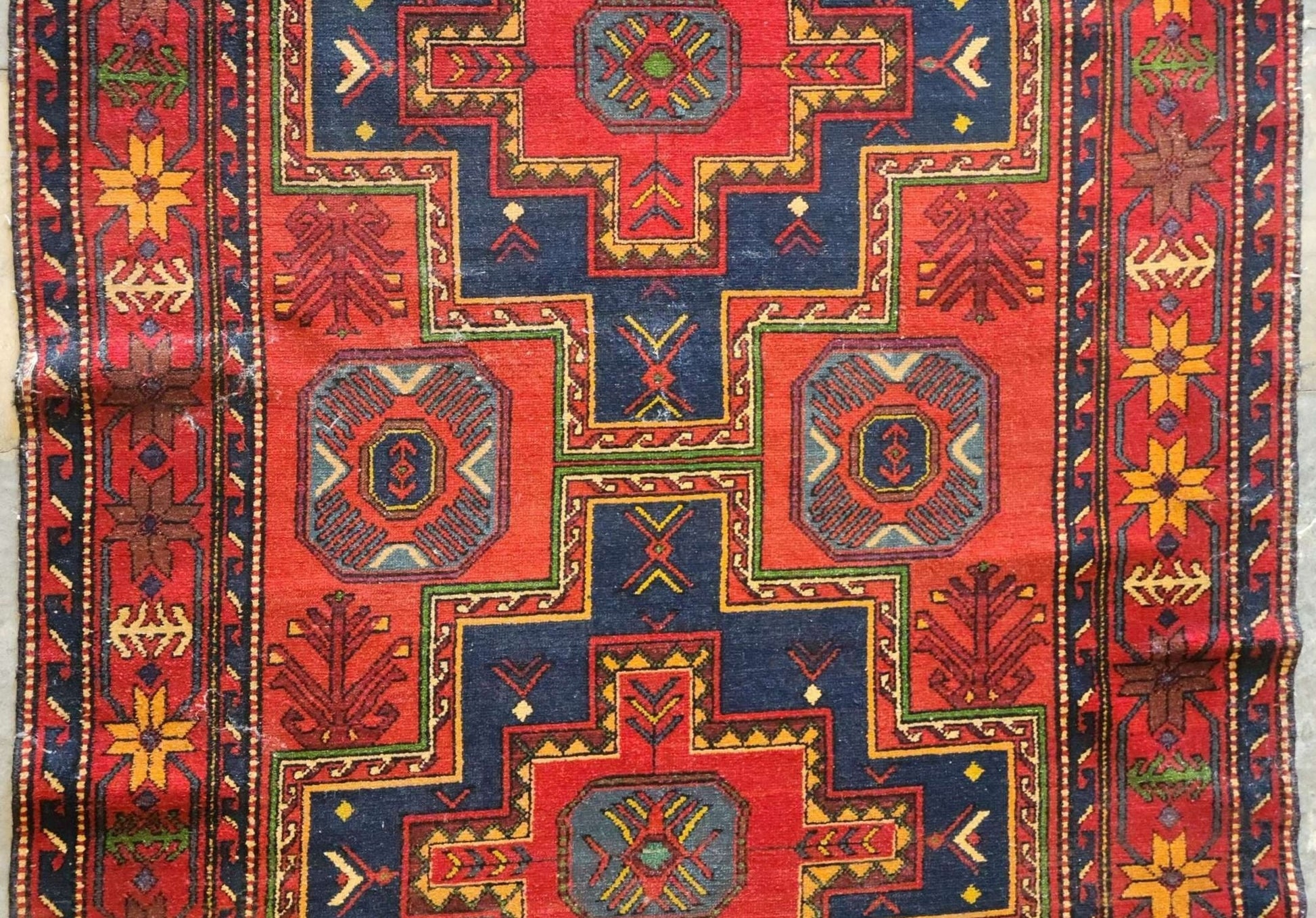 Bring heritage and bold character into your space with this handmade Caucasian Kazak rug, featuring striking red and indigo geometric medallions framed by vibrant floral borders. Traditionally crafted using high-quality wool and natural dyes, this piece reflects the nomadic artistry of the South Caucasus region.
