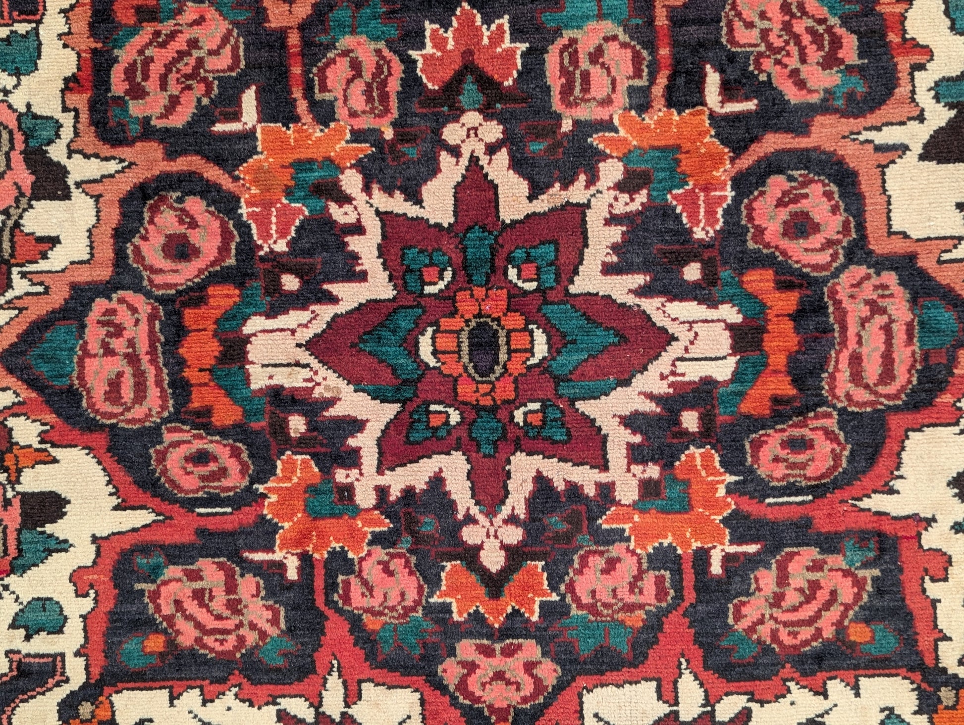 Introduce timeless elegance to your home with this vintage Persian Bakhtiari rug, hand-knotted in the heart of Chaharmahal and Bakhtiari, Iran. Measuring 7x10 feet, this piece features a grand central medallion surrounded by an ornate arrangement of floral and vine motifs, reflecting the classic garden-inspired artistry of Bakhtiari weavers.