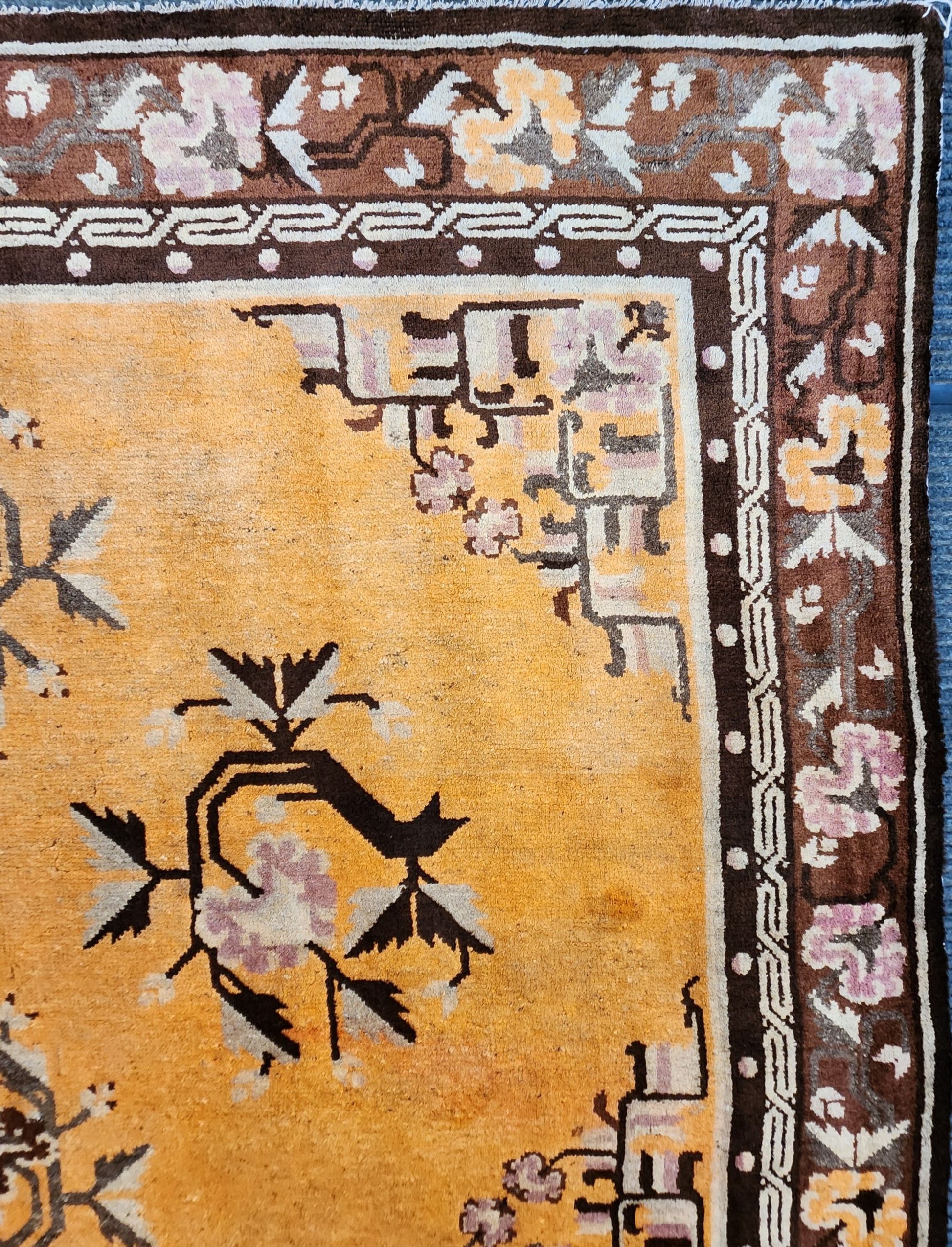Add refined elegance to your space with this vintage Beijing (Peking) carpet, hand-knotted in China and beautifully preserved. Spanning 5x10 feet, this carpet features a golden-yellow field with floral medallions and delicate sprays, framed by a rich brown border adorned with pastel blossoms and traditional Chinese motifs.