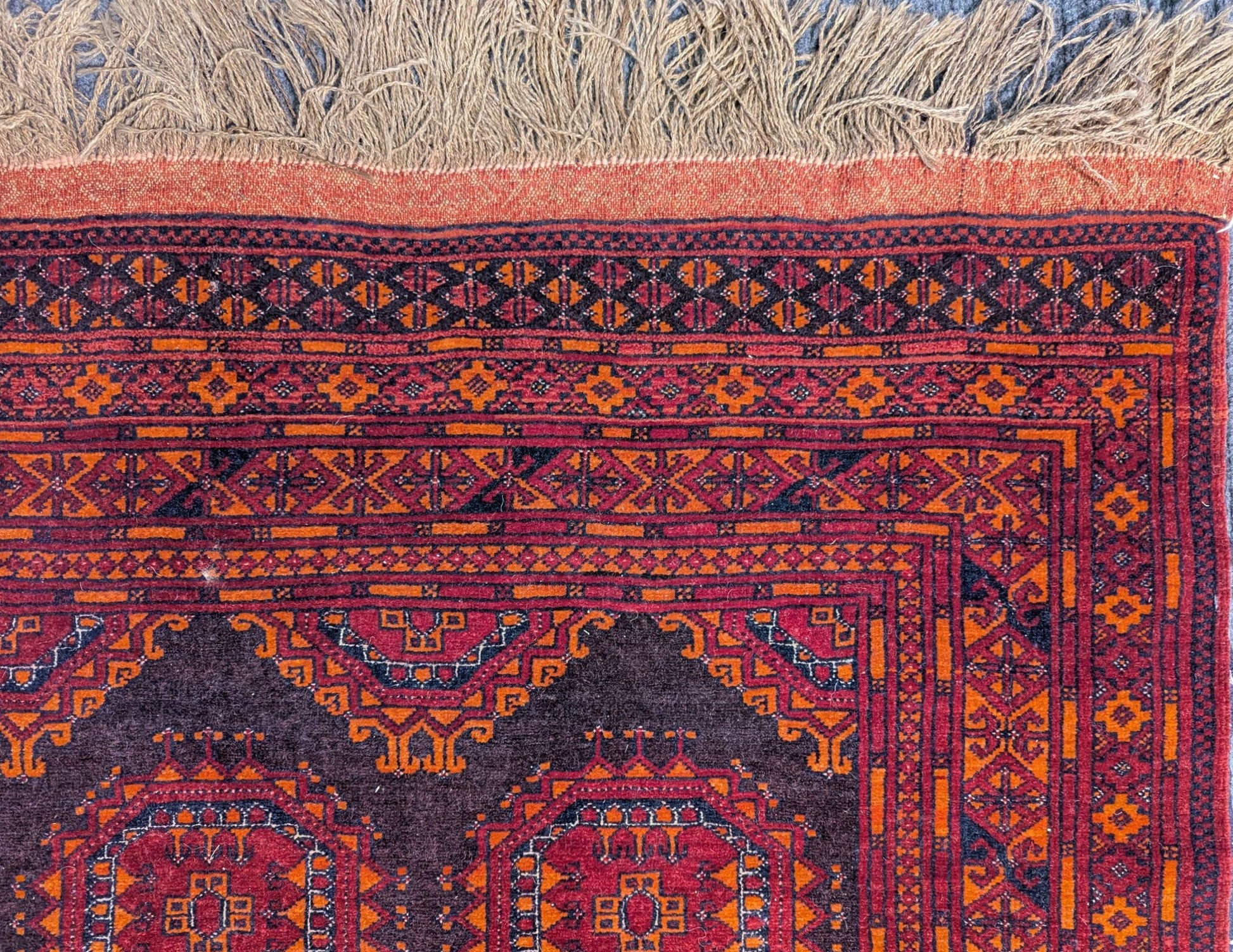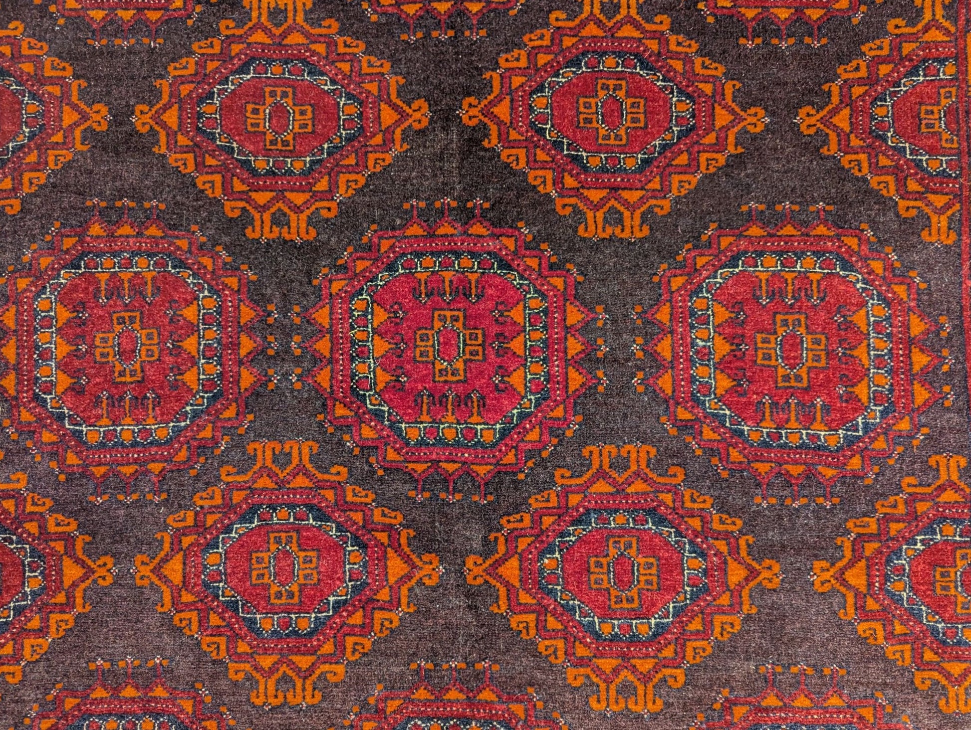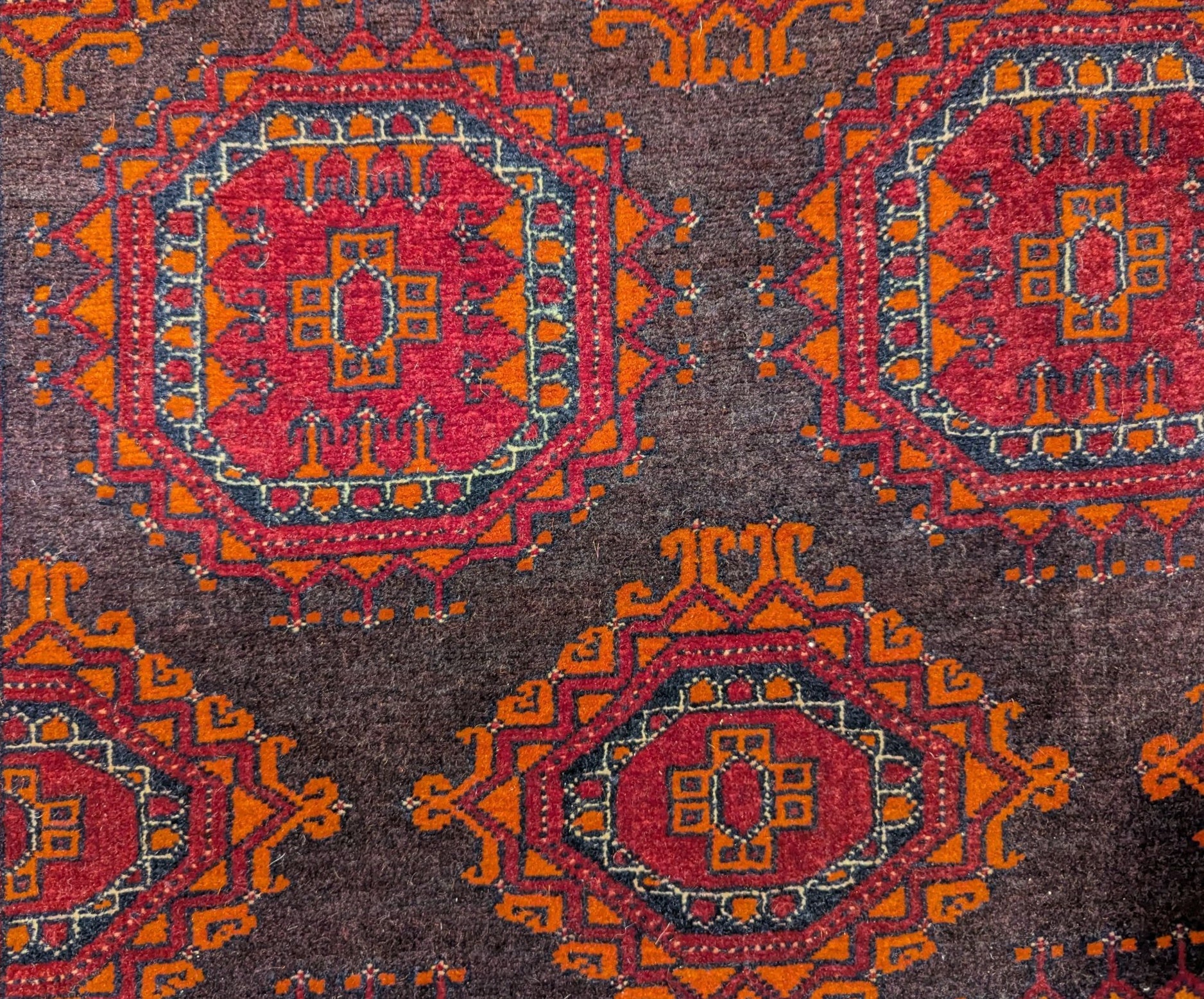 Elevate your space with this stunning vintage Bashir rug, featuring iconic Turkmen gul motifs in vibrant shades of red, orange, and purple. Hand-knotted by tribal artisans, this 4x6 ft rug reflects the bold geometric symmetry and rich cultural heritage of Central Asia. Ideal for both classic and eclectic interiors.