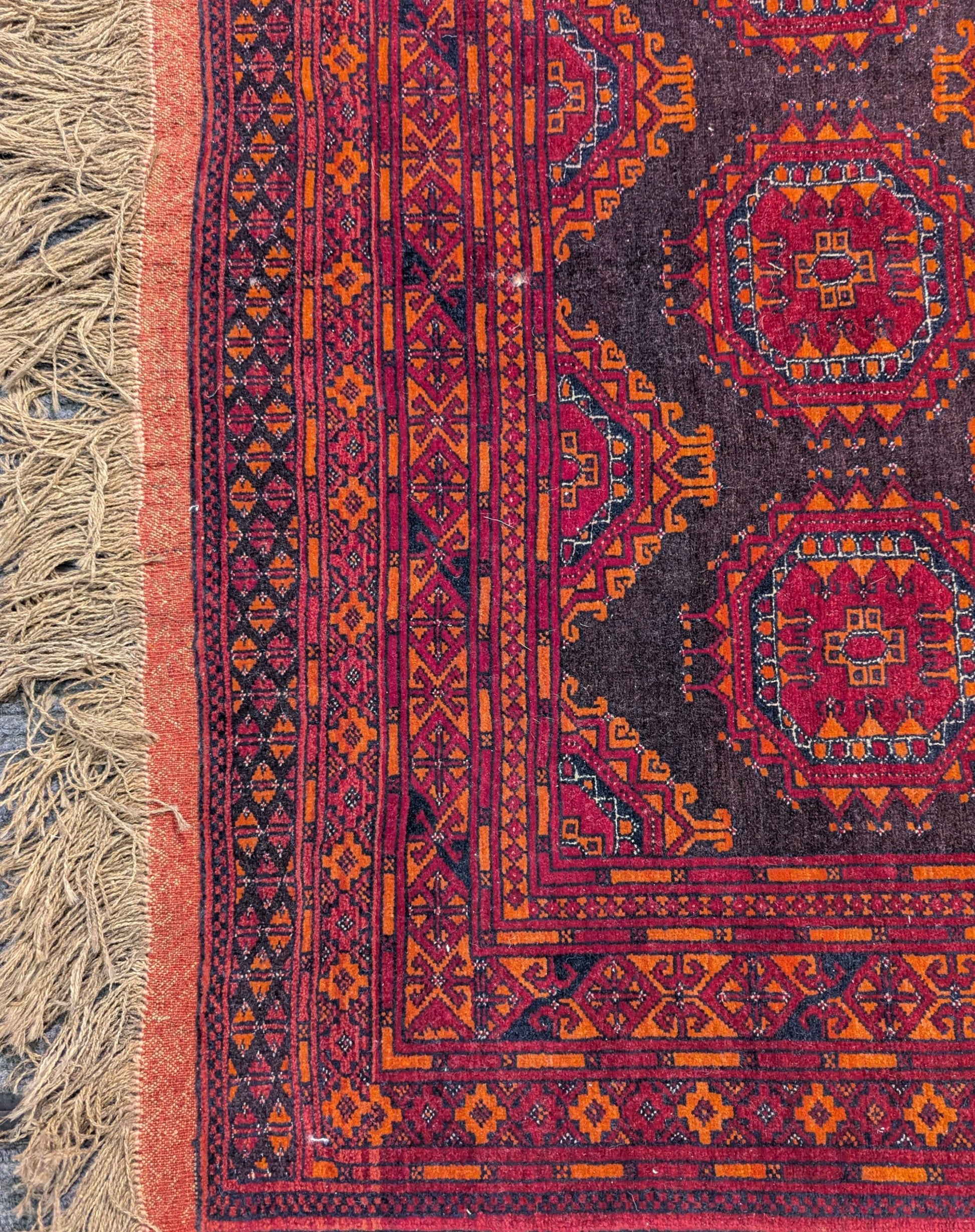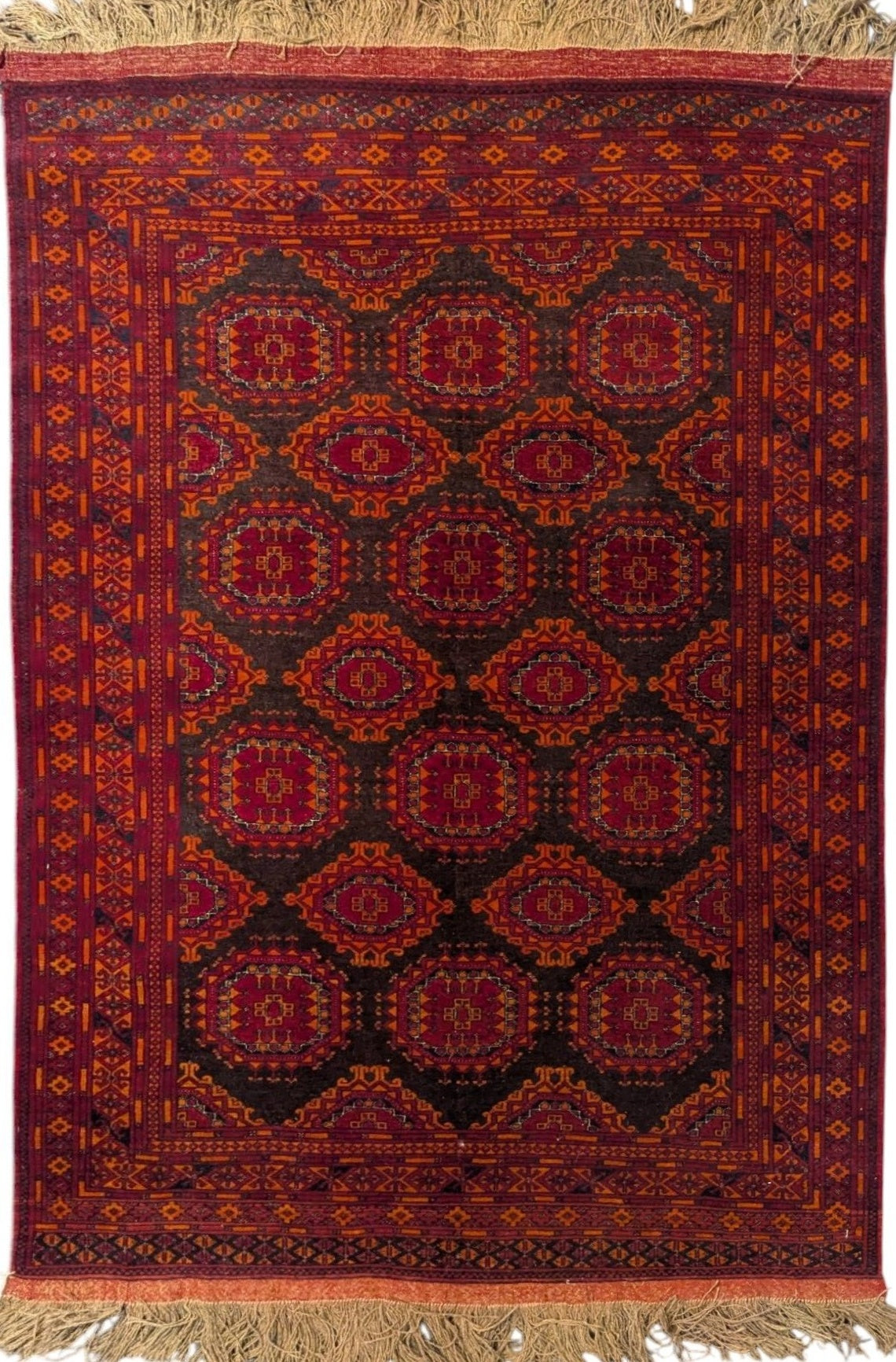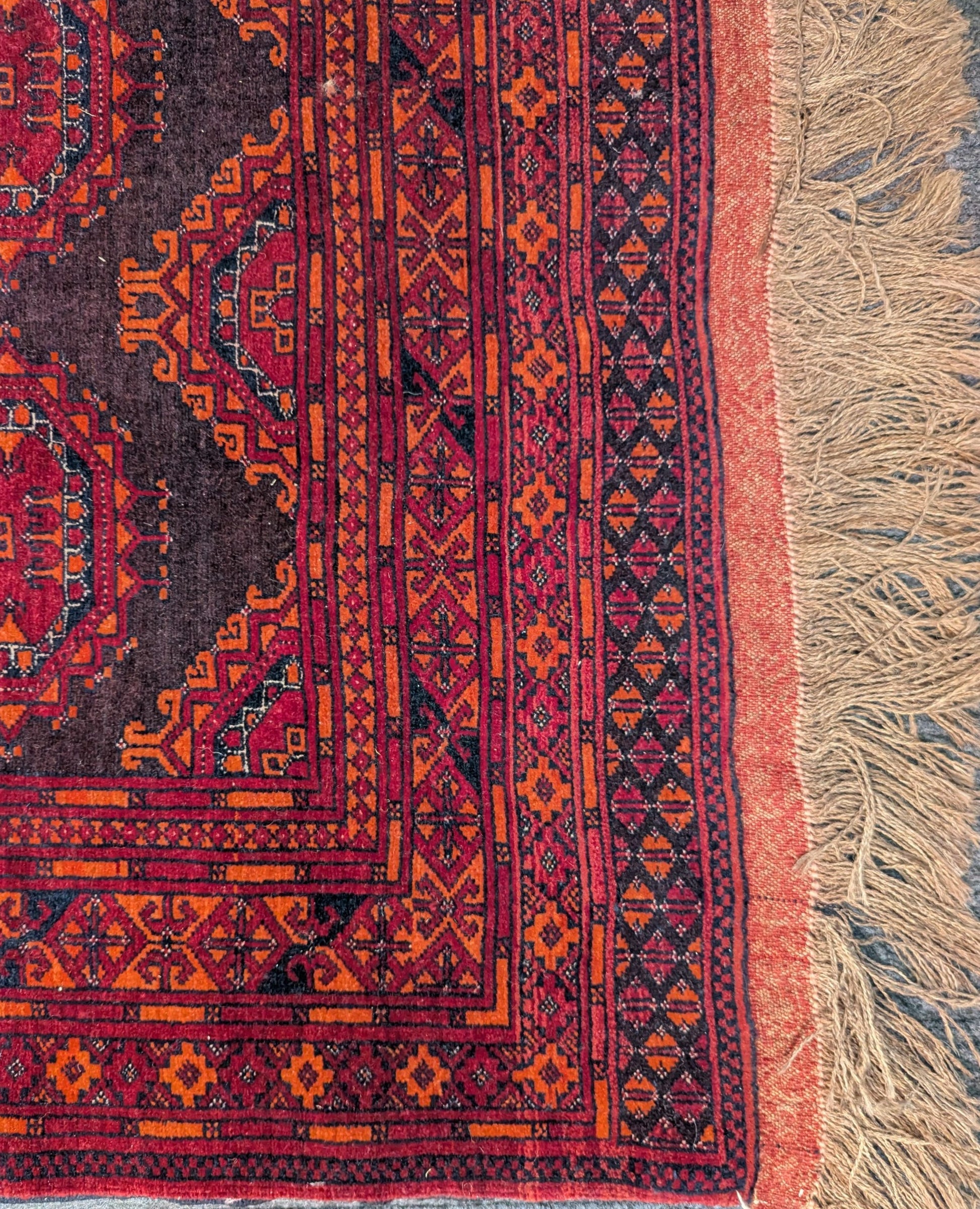 Vintage Bashir Turkmen Rug – 4x6 ft – Deep Red & Orange Tribal Motifs (Sn:3627)