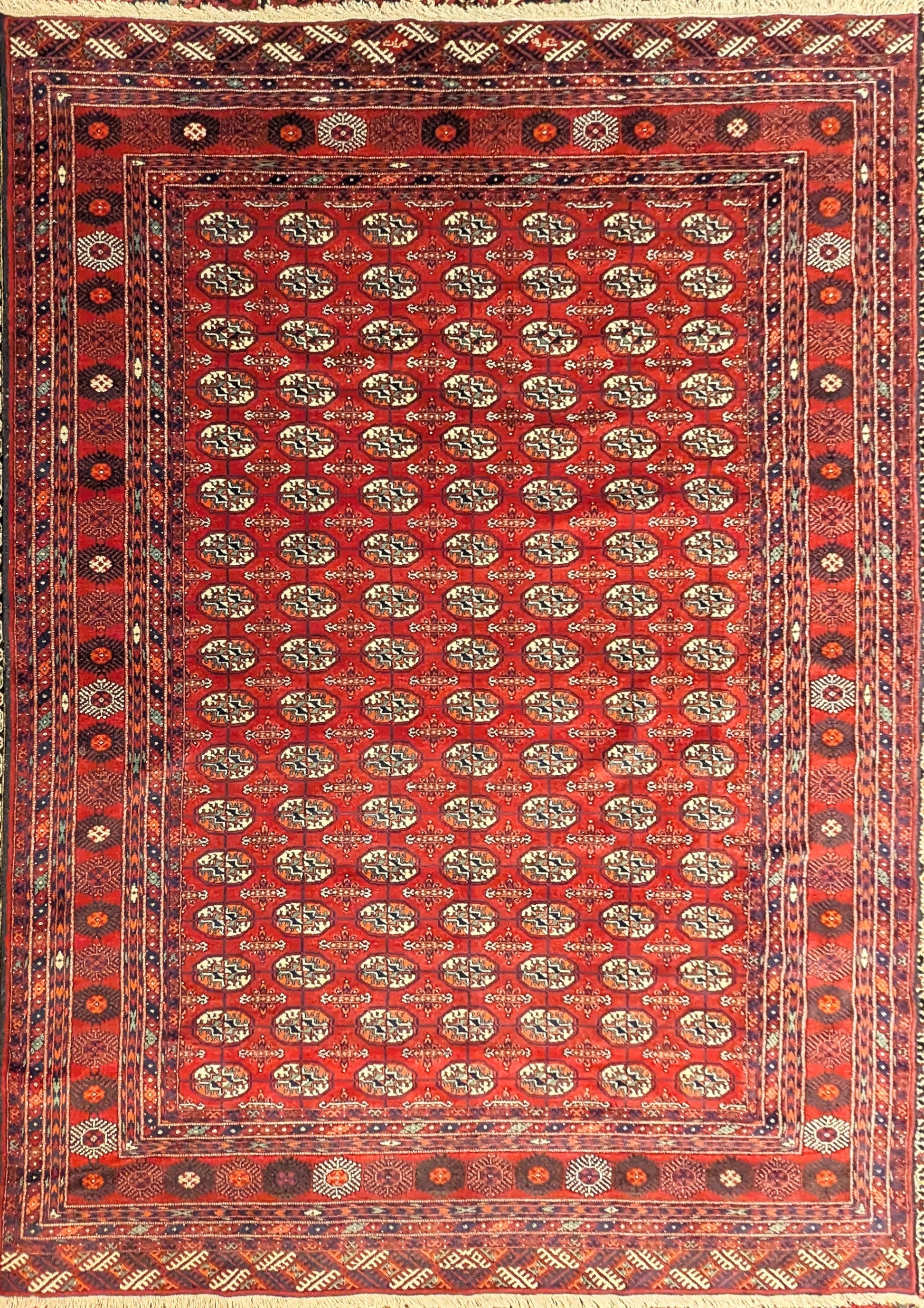This vintage 6.5x9 ft Pakistani Bokhara rug features a deep red field adorned with traditional “elephant foot” (Tekke gul) motifs in ivory, blue, and burnt orange. Hand-knotted over 45 years ago, it reflects the influence of Turkmen design, interpreted through the skilled craftsmanship of Pakistani weavers.