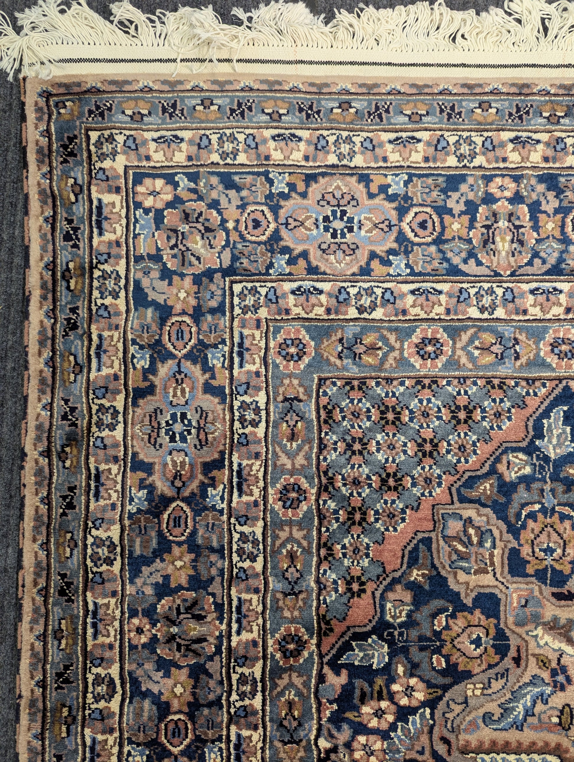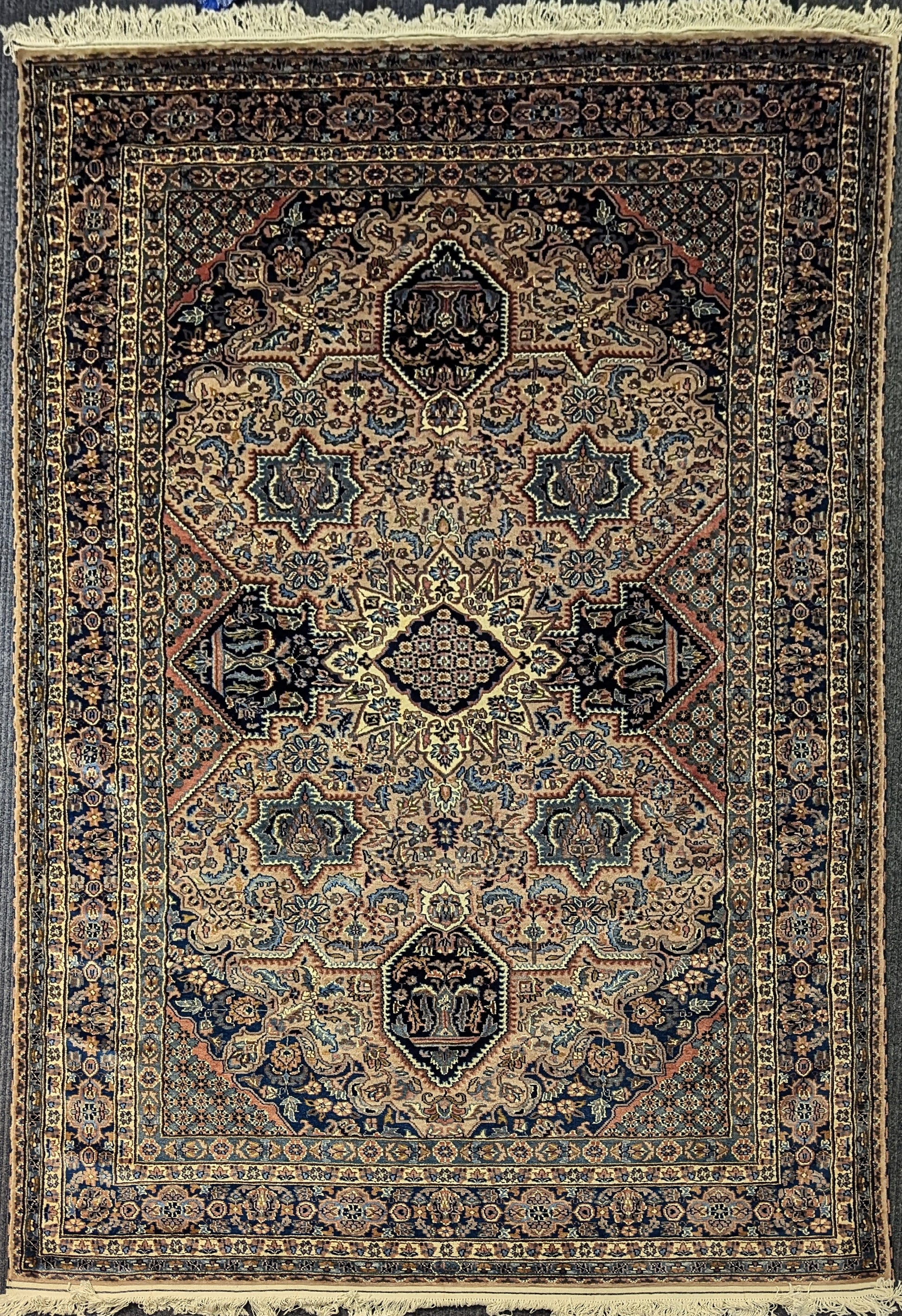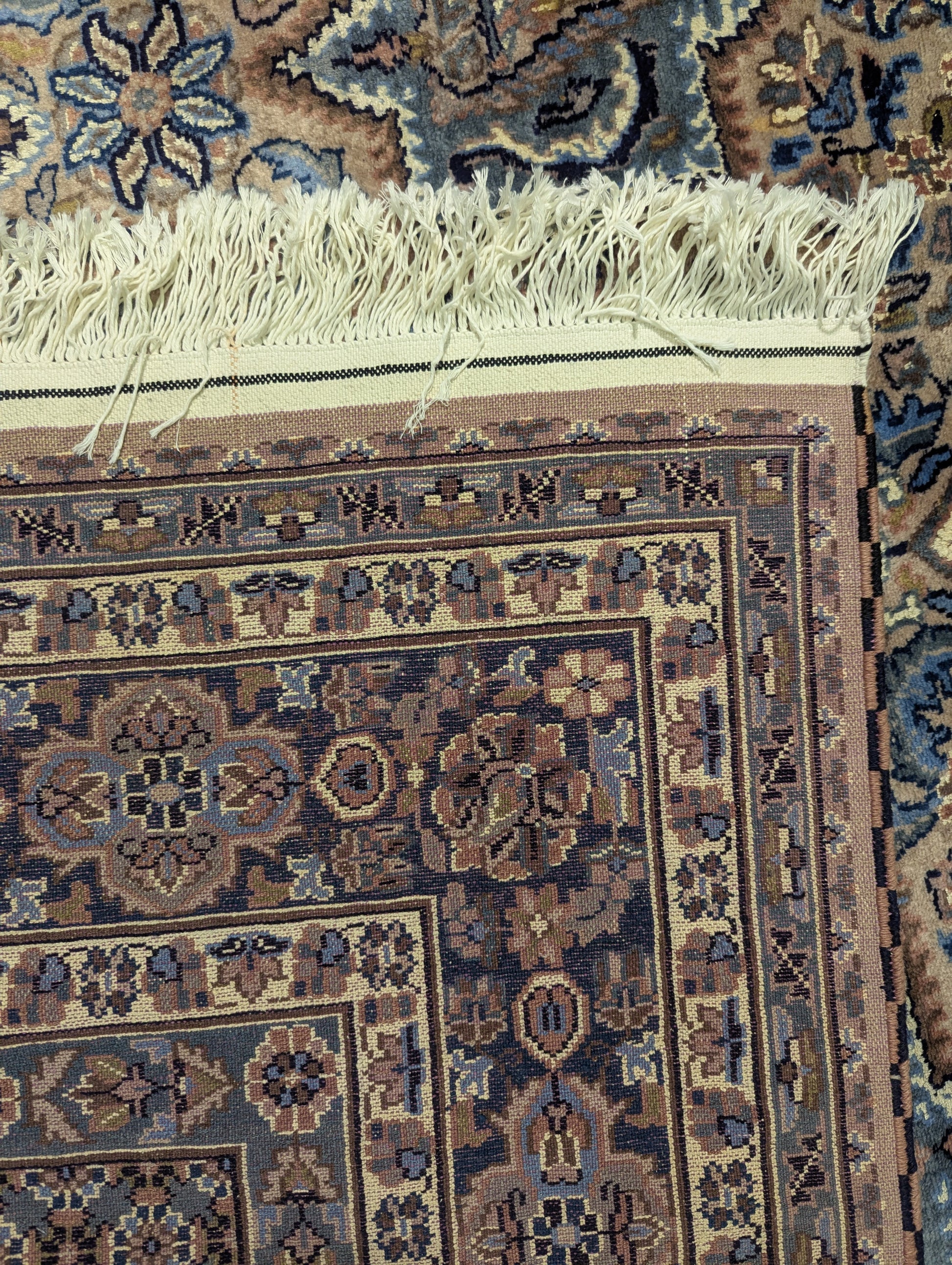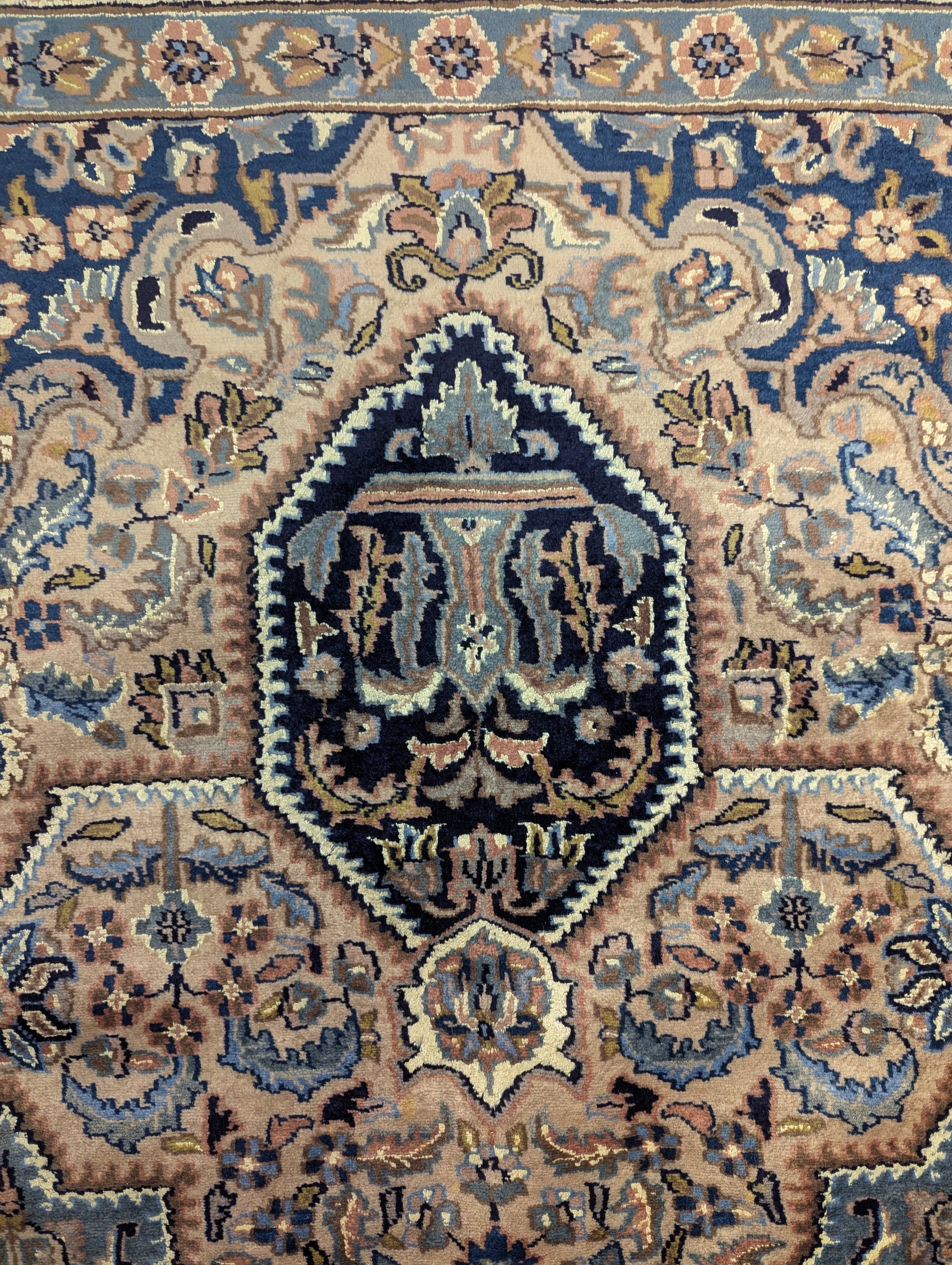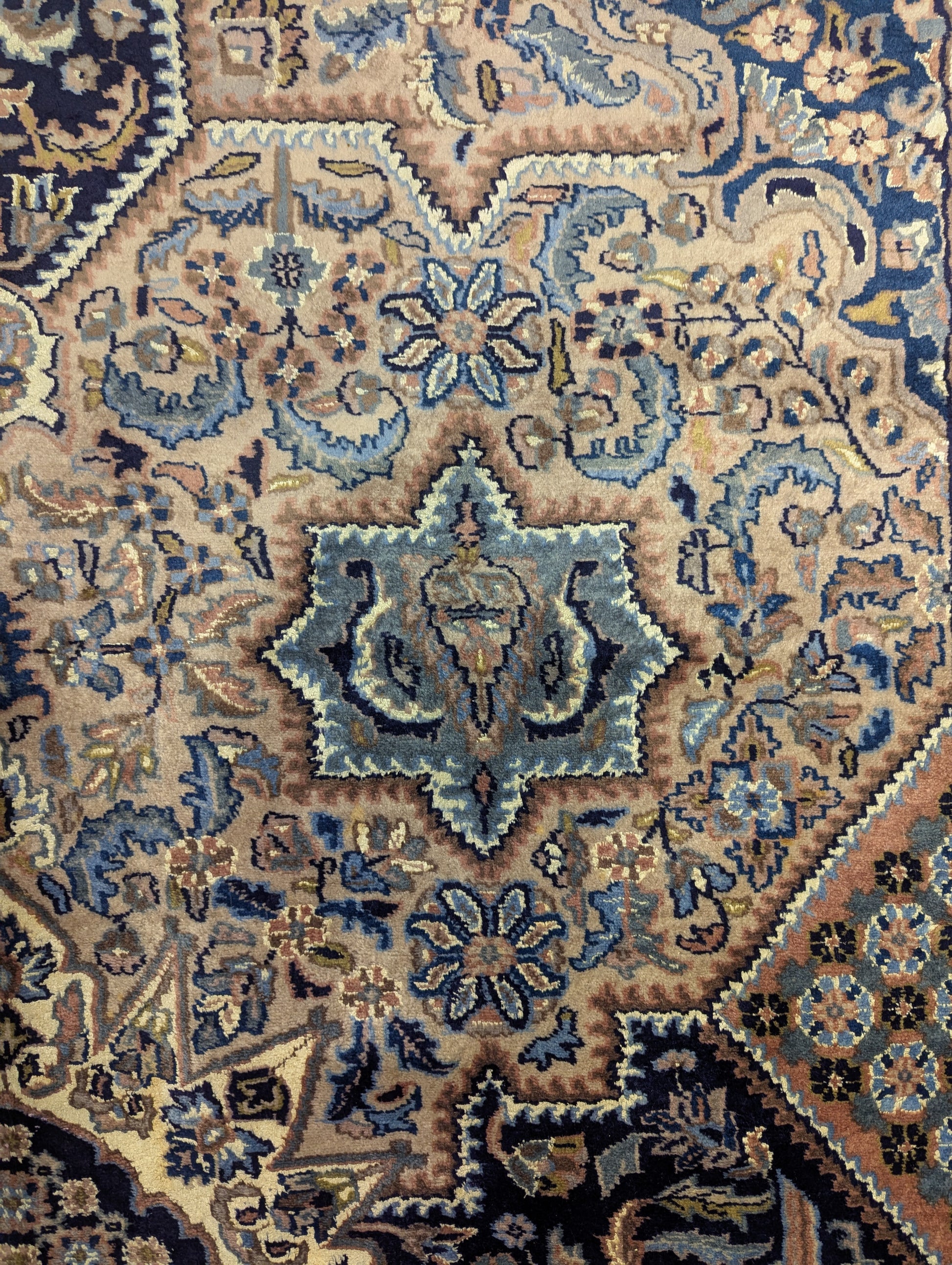 Hand-knotted using the single knot (Senneh) technique, the rug is made of high-quality wool on a cotton foundation, offering a dense, durable weave and soft texture. Its elegant palette of navy blue, beige, dusty rose, and muted ivory tones makes it a perfect fit for classic interiors, dining rooms, or formal sitting areas.
