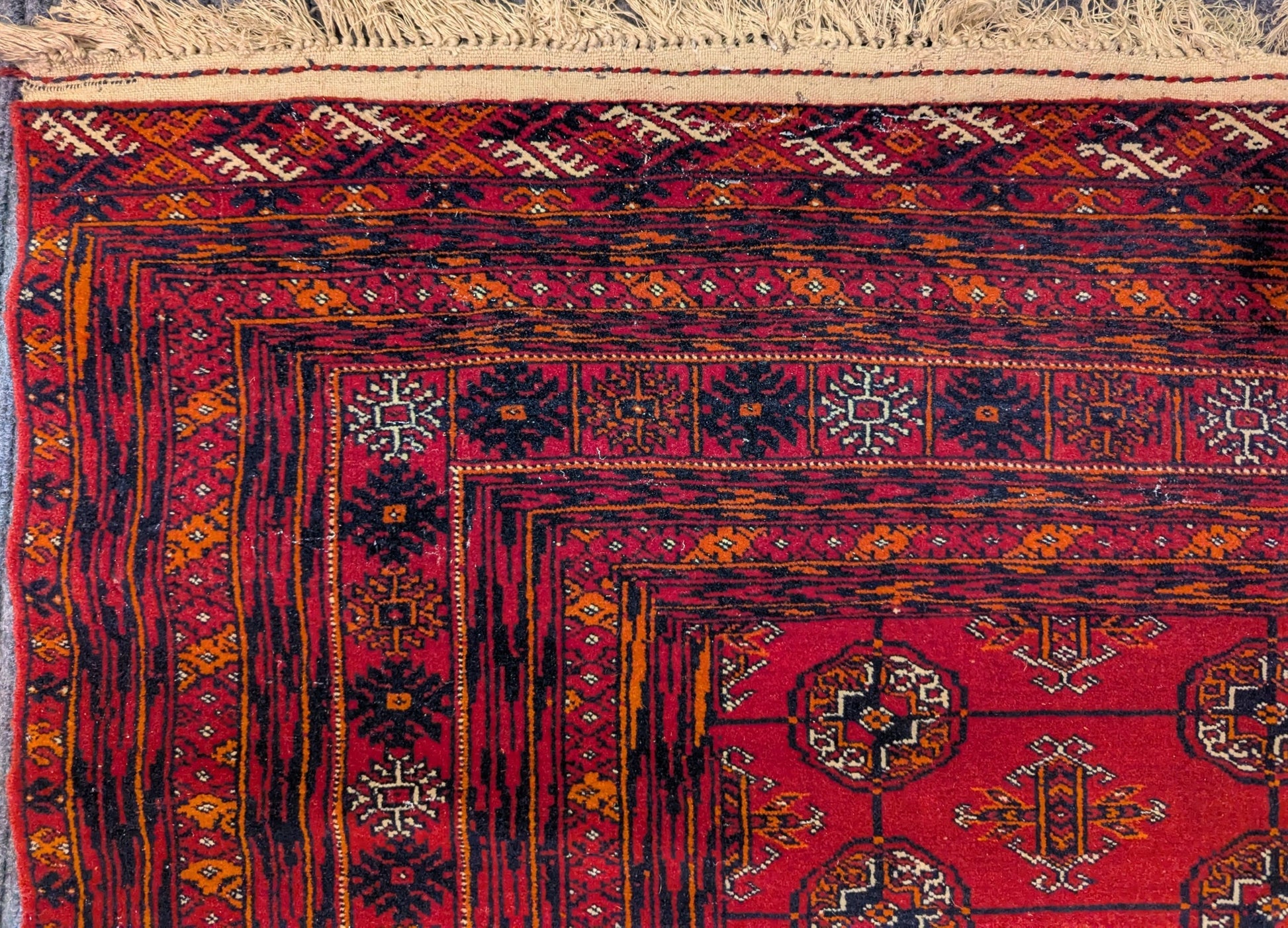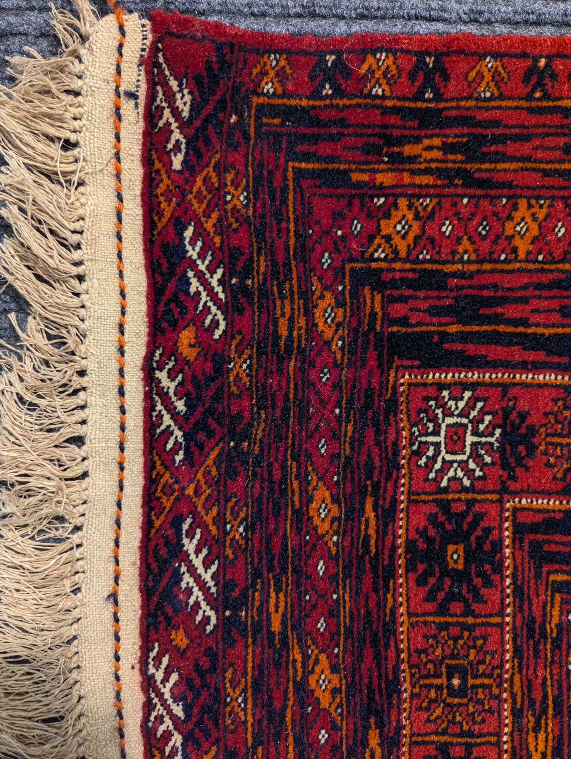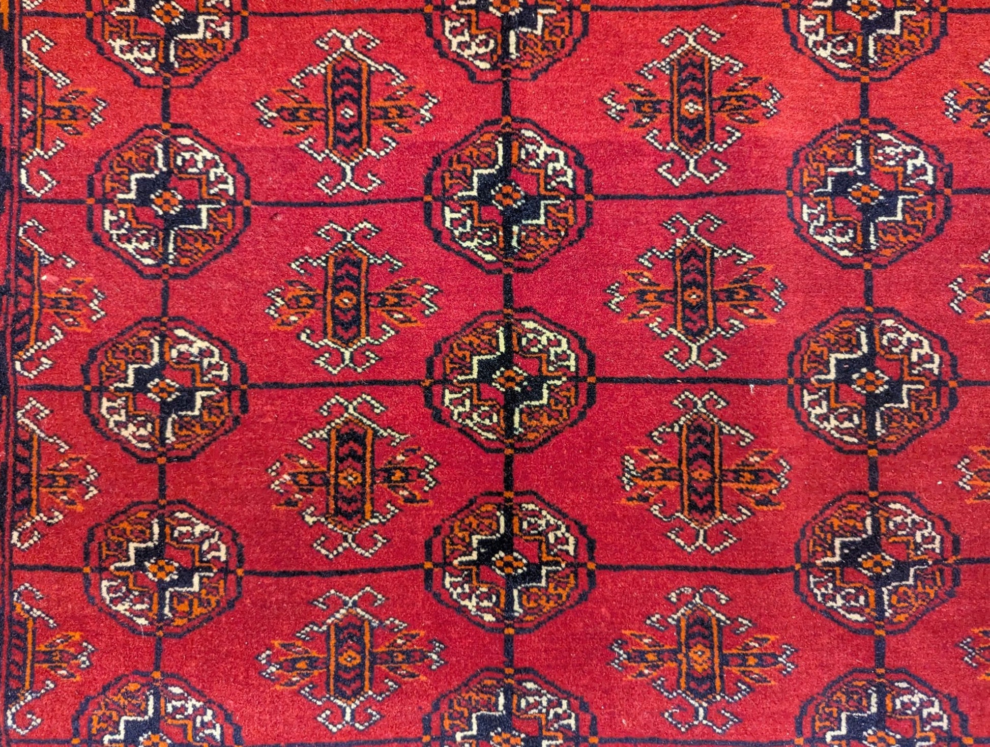 Add timeless charm to your home with this exquisite handmade Bokhara rug. Crafted with fine wool, this piece features the iconic elephant foot gul motifs in deep red and rust tones, symbolizing strength and tradition. Woven by skilled artisans, this vintage carpet is estimated to be from the 1970s-80s and remains in beautiful condition.
